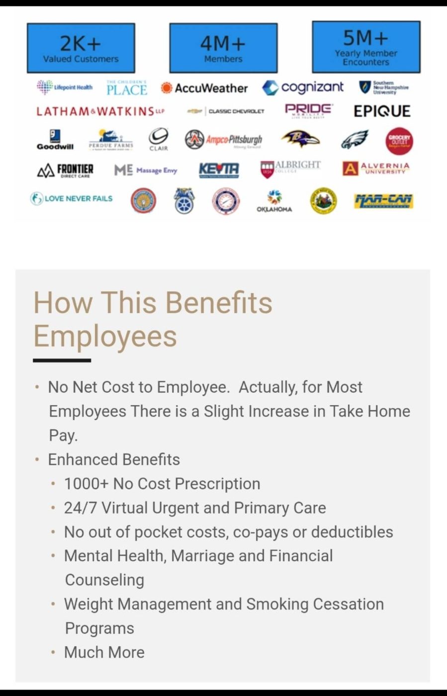 • Require no insurance or co-pays for over 1000 medications, 24/7 care, mental health, marriage and financial counseling, telehealth in-app scheduling, weight management and smoking cessation programs (including) ozempic, primary care, and much more: