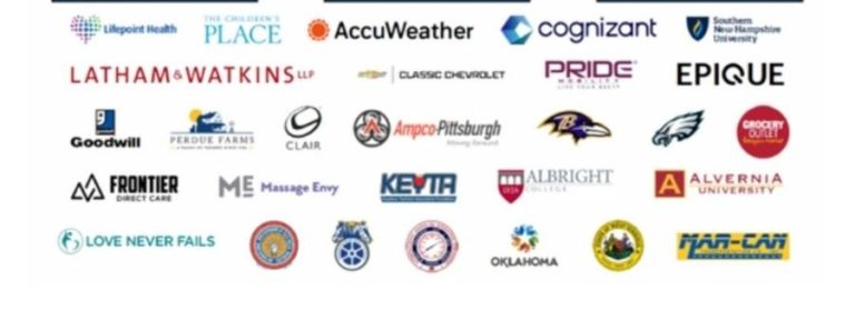 Krispy Kreme, Massage Envy, Cognizant, Classic Chevrolet, AccuWeather, US Electrical Services, Amp-co Pittsburgh, Sikich accounting, advisory and technology firm, Fuji Oil, Frontier Direct Care, Toll Brothers, Area, Villari, GNC, Goodwill, Rail Inc, Grocery outlet, Kevita, Perdue Farms, The Children's Place, Lifepoint Health, Love Never Fails, Pride, Latham & Watkins, Epique, Mar-Can.