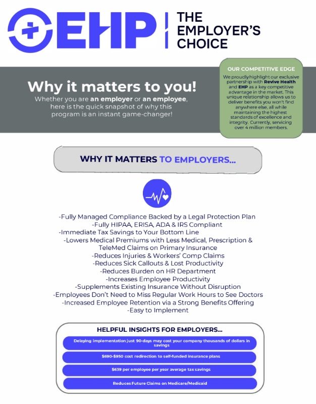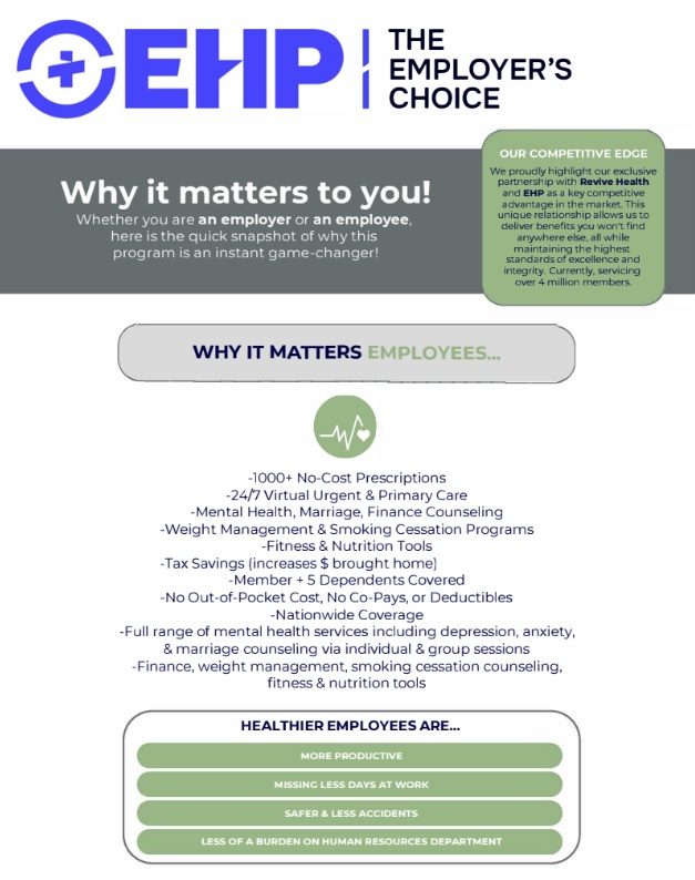 Through the Preventative Healthcare Program (EHP) and our partner Revive, your business can offer fully-covered preventative care services that: